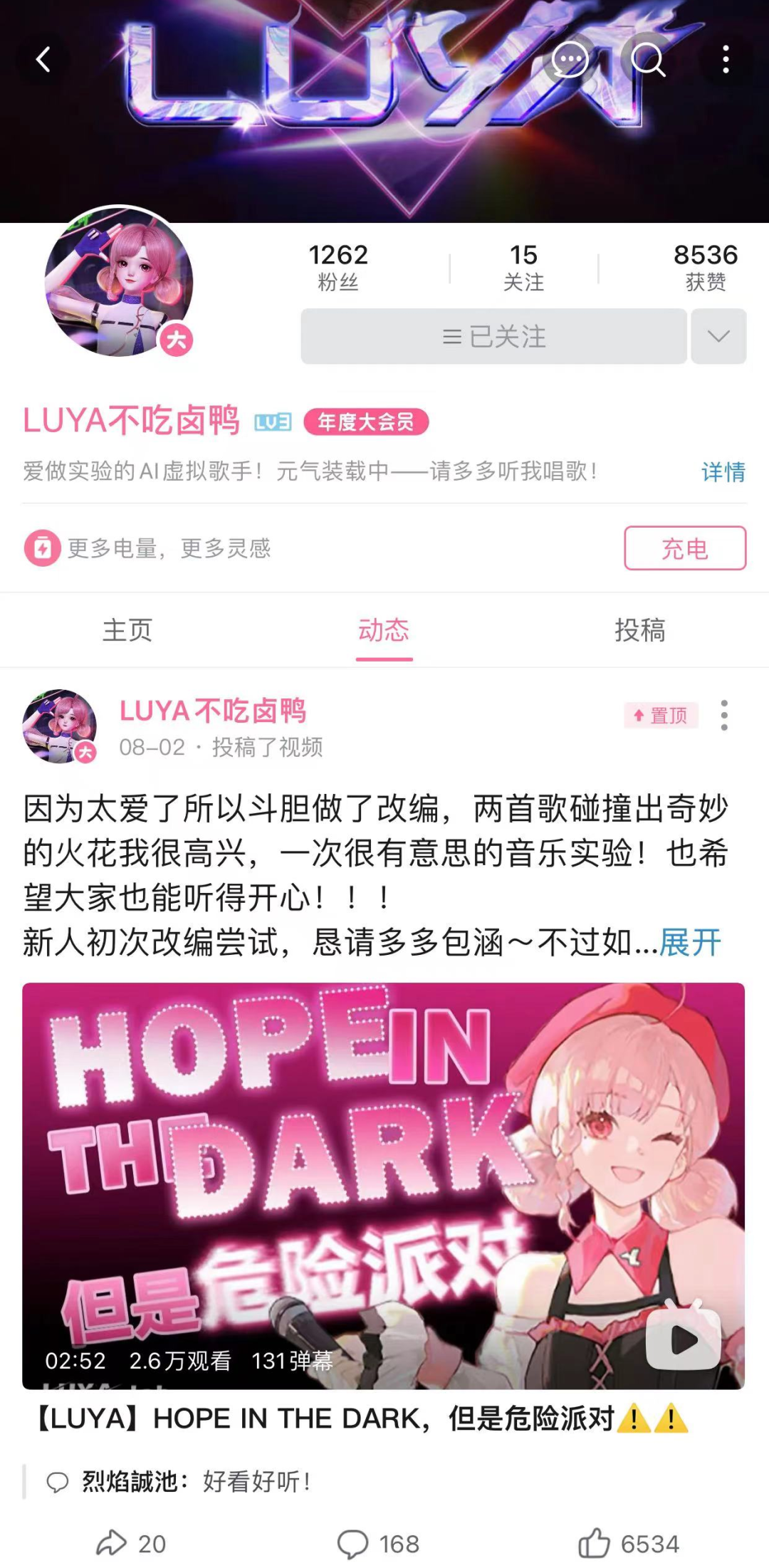 作为刚刚出道的虚拟歌手,Luya除了在音乐平台发布原创歌曲外,也在各个平台分享自己的翻唱和原创歌曲哦,全平台账号名都叫“LUYA不吃卤鸭”,速速关注一波,入股不亏。