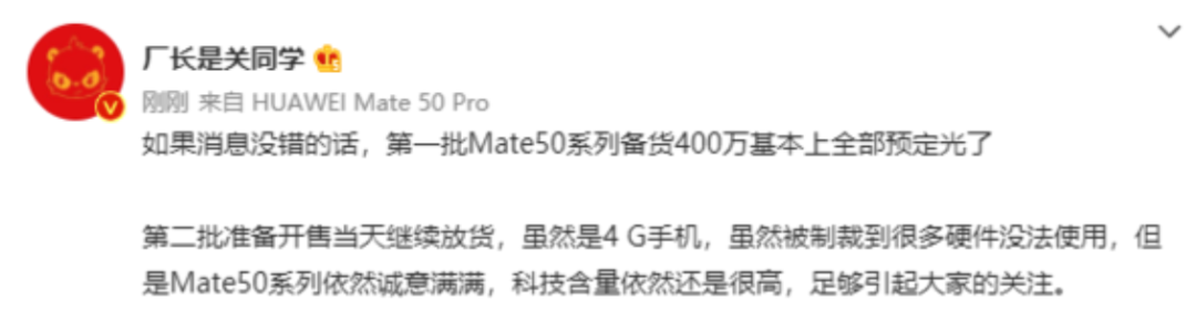 “第一批Mate 50系列备货400万基本上全部预定完了。”