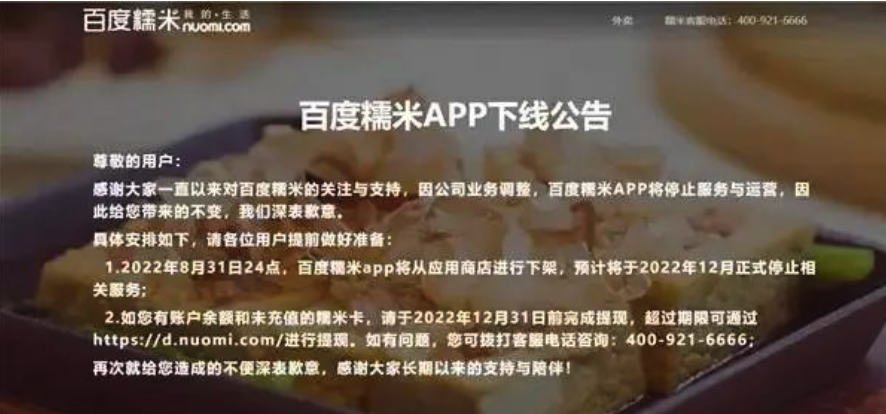 近期,百度糯米在其官网发布了《百度糯米 APP 下线公告》