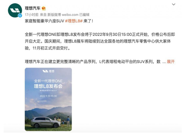 近期,理想汽车官方宣布,全新一代理想ONE——理想L8,将于9月30日15:00的发布会上正式公布售价,11月初正式开启交付。