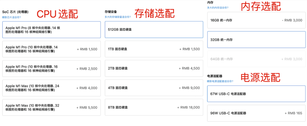 值得一提的是,这回苹果给新MacBook Pro提供了十分丰富、详尽的“选购清单”,皮衣刀客看了都得直呼内行: