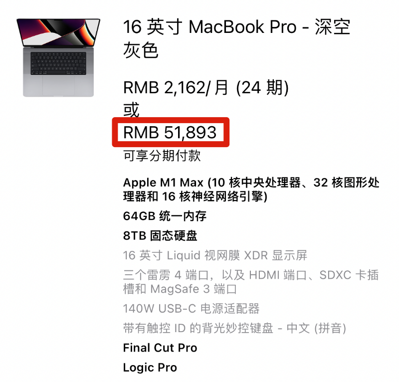 ——“16英寸MacBook Pro 32核M1 Max 64G+8T 带140W充电器国行版“