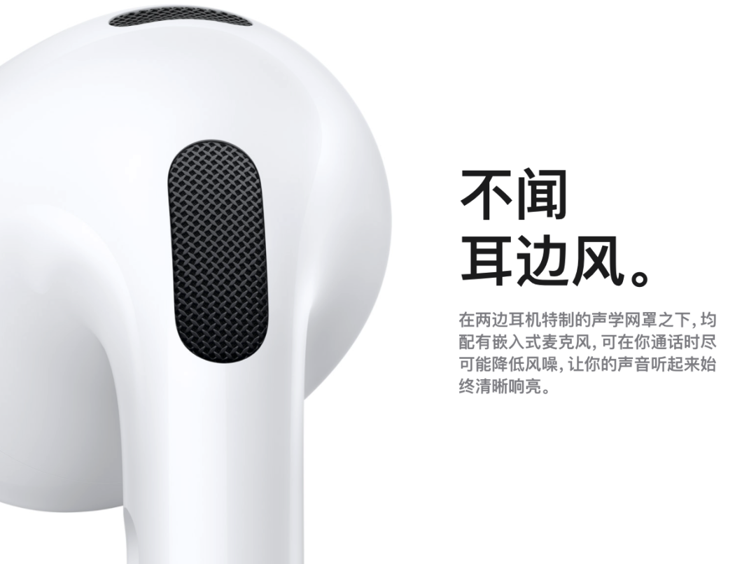 当然了,尽管主动降噪是大哥Pro才能玩儿的,但这回AirPods 3还是给到了“物理降噪”——就是将麦克风嵌入网罩内,尽可能在☎️时为你降低噪音。