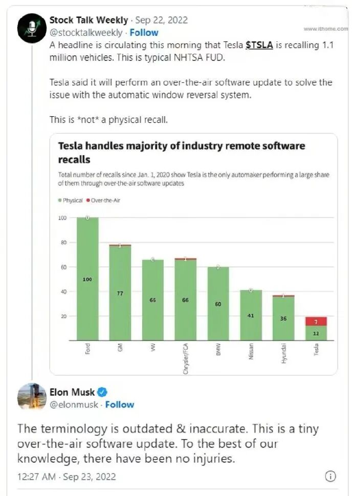 不过,特斯拉CEO马斯克则认为,这只是一个小的OTA更新,并不需要将车开到维修店,美国国家公路交通安全管理局将它称之为“召回”是过时并且不准确的。根据美国国家公路交通安全管理局的定义,软件更新也属于“召回”的范畴。
