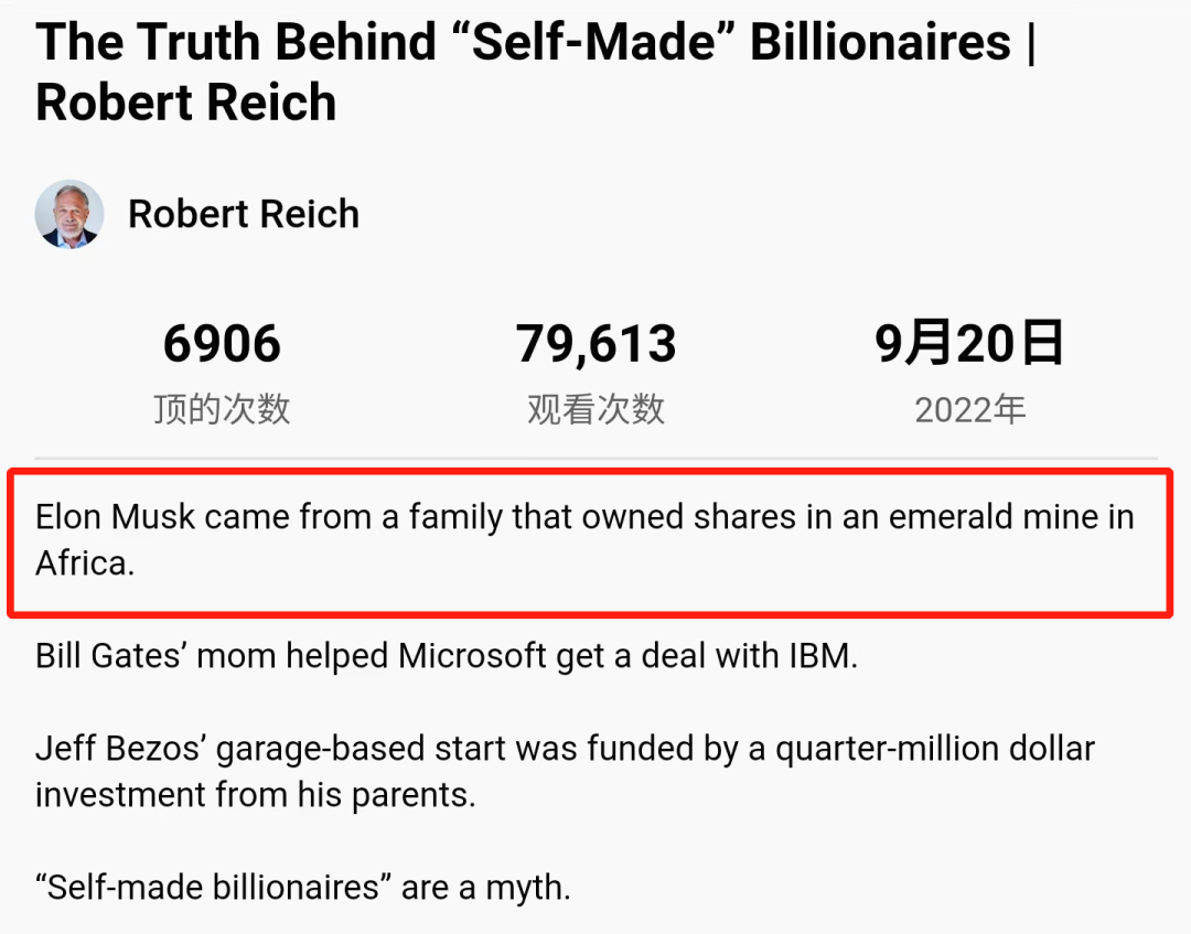 近日,美国前劳工部长莱希(Robert Reich)表示, 马斯克并非白手起家,他家在南非拥有祖母绿矿。