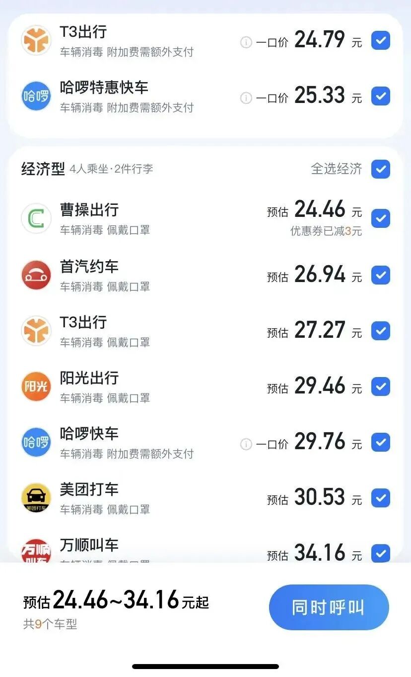 以前的打车入口——“出行服务”,是将各个打车程序集中呈现,大家可以多选或者自行选择某一家打车平台。