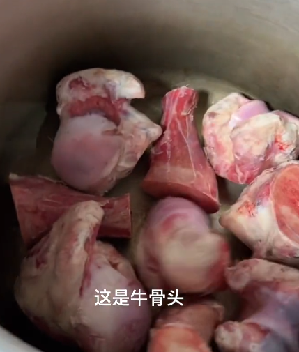 厨师大哥解释因为牛骨头里有骨髓,汤煮出来很白,而羊骨头是煮不出白汤。牛骨煮了3个小时后,汤还是透明的,并不是乳白色,厨师大哥又解释说放置一晚就能变白了。