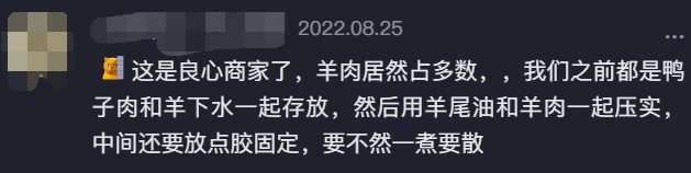 有网友吐槽:“羊肉放多了,应该放鸭肉、羊肉香精、羊尾油、加点卡拉胶、保水剂,咔咔这么一卷,正宗羊肉片做出来了……”