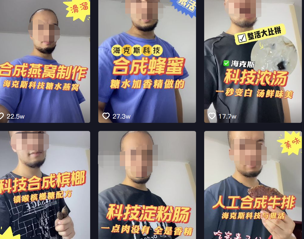 辛吉飞的各种科技视频过多,什么合成燕窝、蜂蜜、淀粉肠、超大鸡排、拉丝鸡柳棒,就不一一展示了。