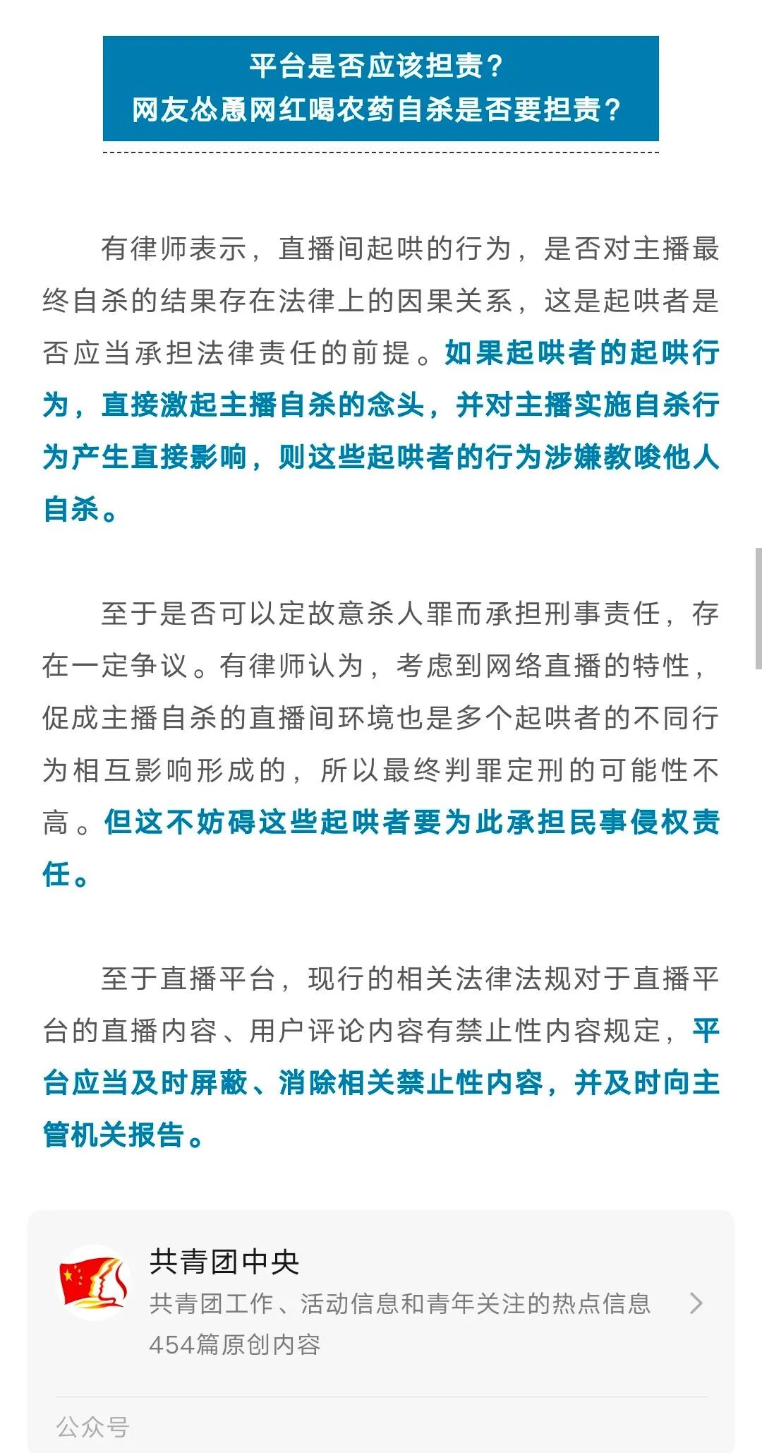 共青团中央:《这都有人起哄?!主播直播中喝农药去世,其母亲表示将追责》