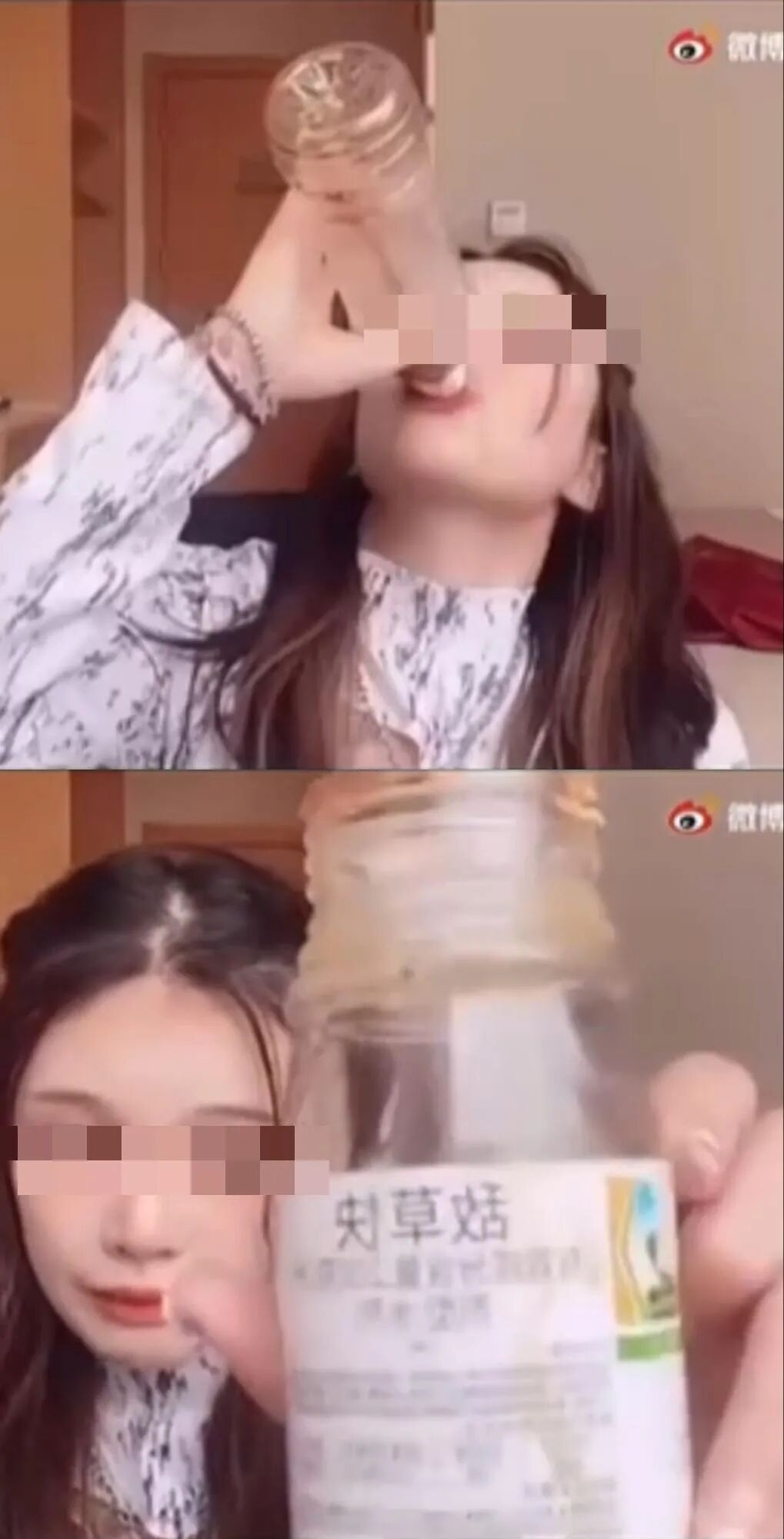 她拿着喝光的瓶子露出“敌草快”的标签。