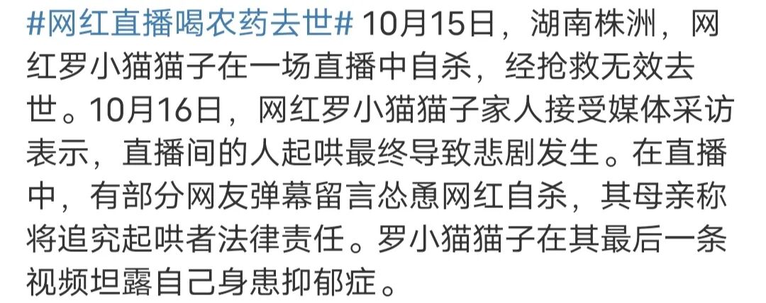 其实罗小猫那天并没有真的想要自杀,喝农药是为了挽回男友,但在直播间的起哄和催促声中,最终使她选择了死亡。