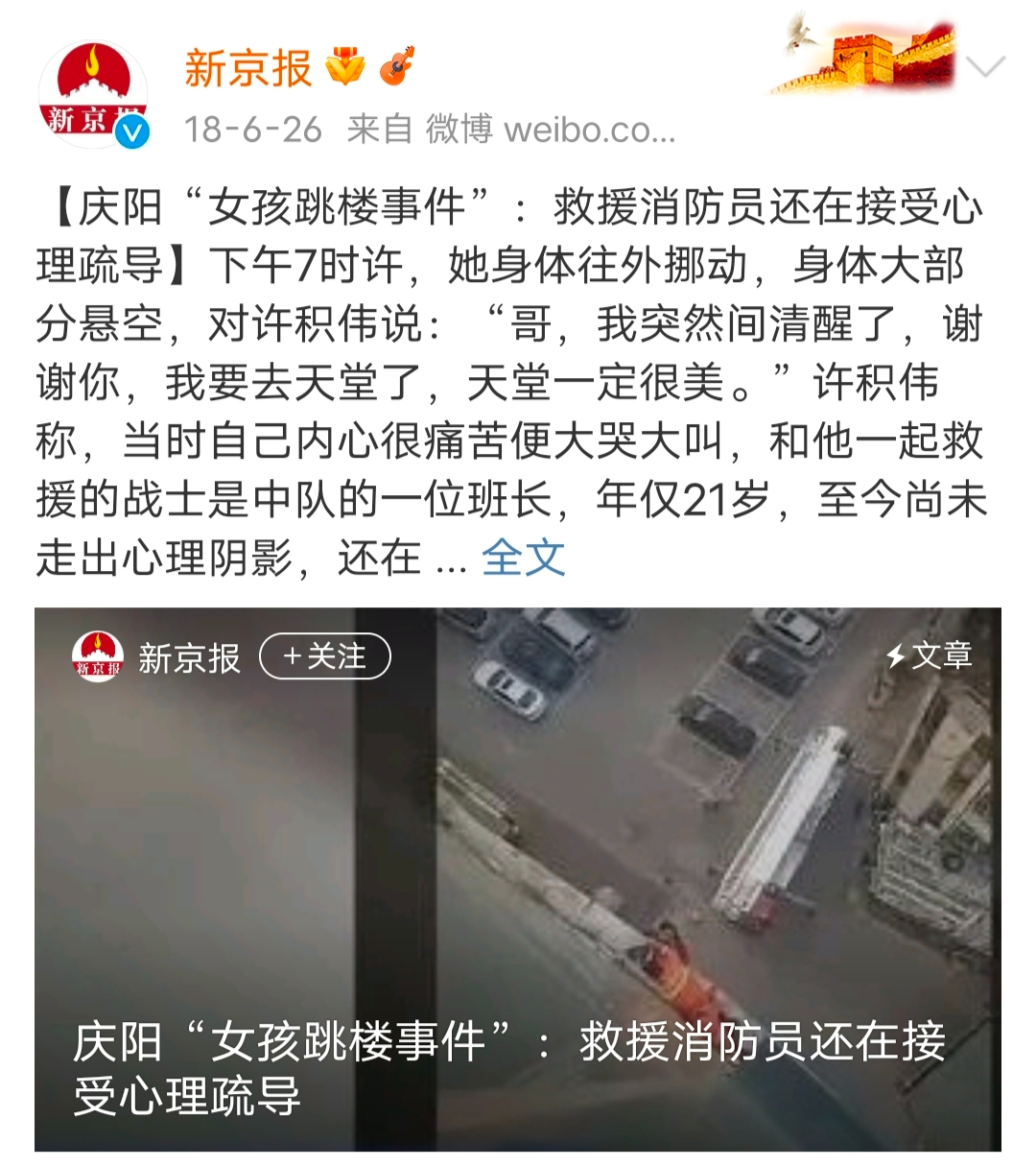最终女孩向消防员说了句,“哥,谢谢你,我走了。”便松开手纵身跃下。