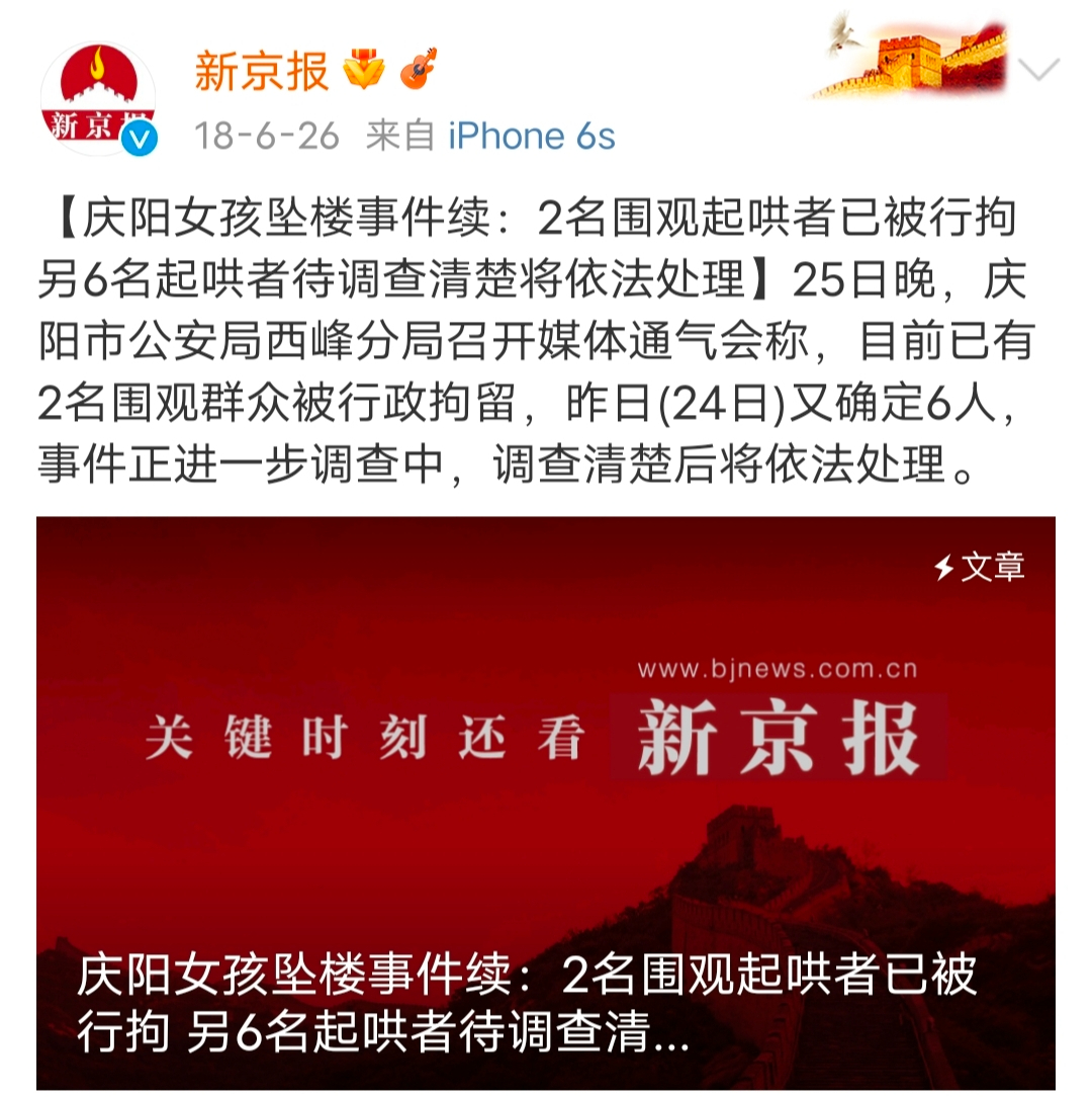 庆阳市公安局公布,行政拘留了6名事发当晚在现场起哄、拍摄视频妨碍救援的人员。