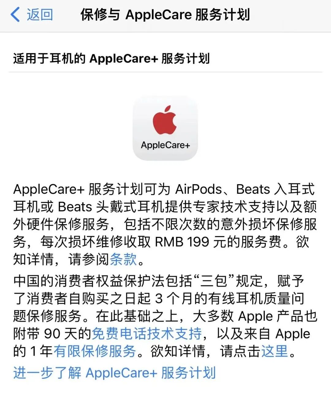 或者,你还可以在购买耳机的时候花钱增购苹果官方的AppleCare+。