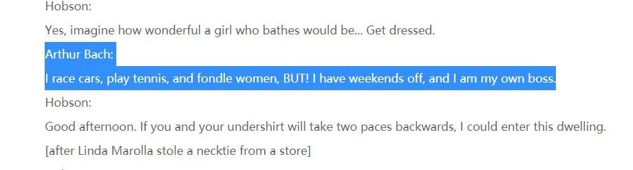里面的一句经典台词:I race cars, I play tennis, I fondle women, but I have weekends off and I am my own boss(我开豪车、打网球、爱抚摸辣妹、周末双休还有我是自己的老板)