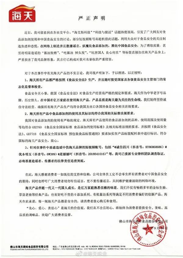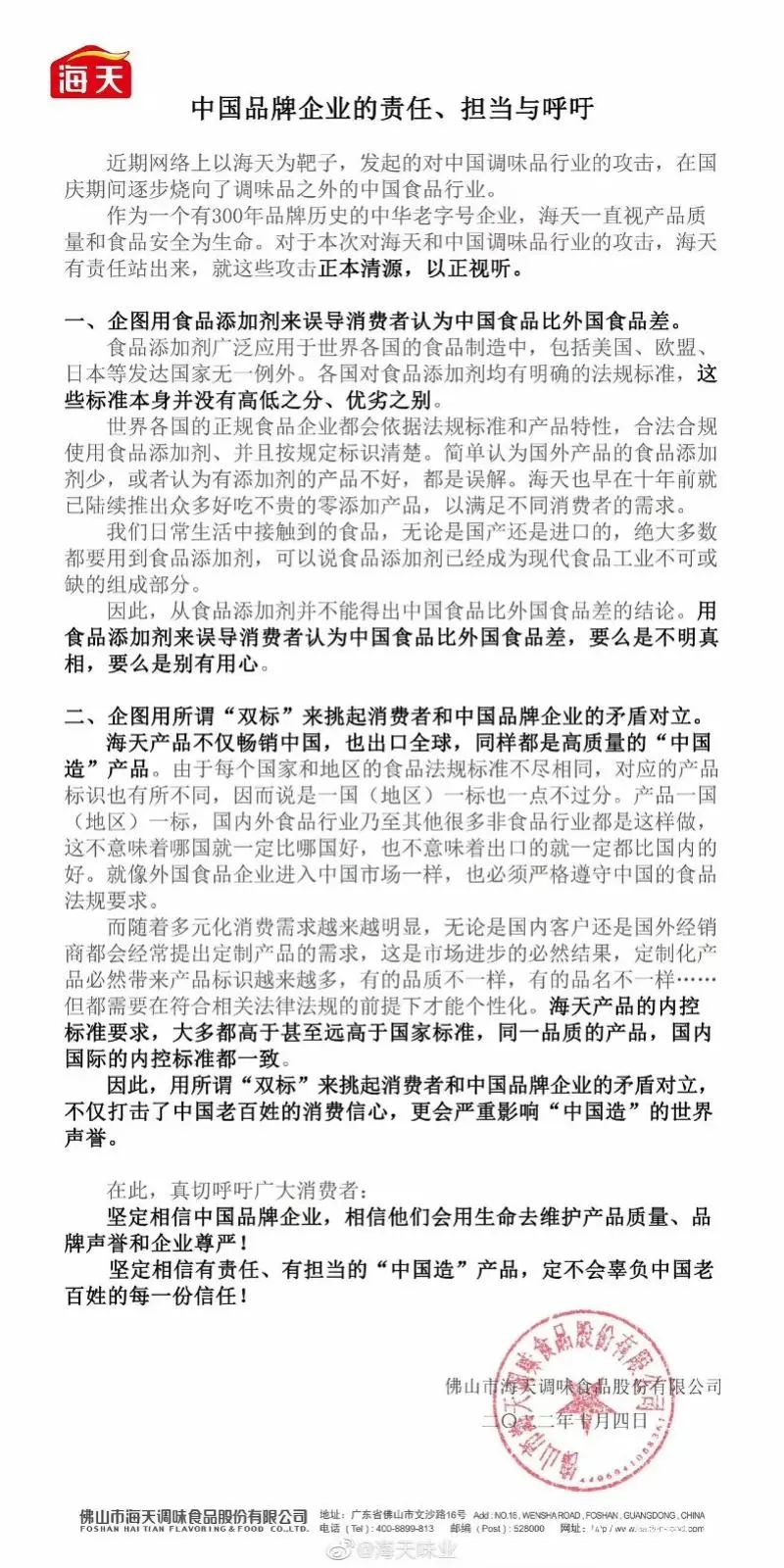 对此,海天酱油的母公司海天味业也在第一时间发表了声明,回应了相关对于“添加剂”的争议: