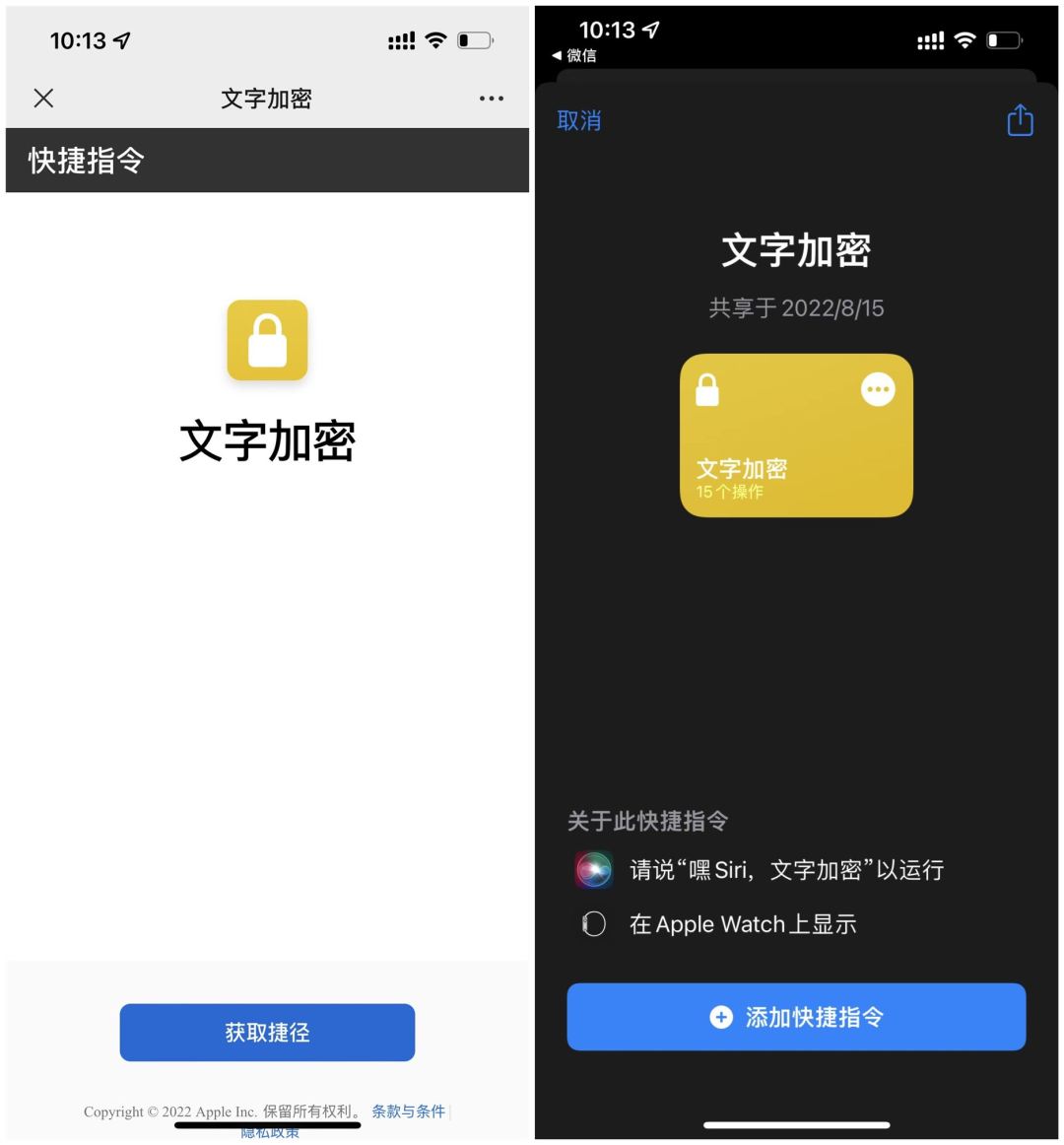 首先,大家需要在自己的iPhone上添加一个【文字加密】的快捷指令。快捷指令我给大家找来了,点击文末阅读原文即可添加。