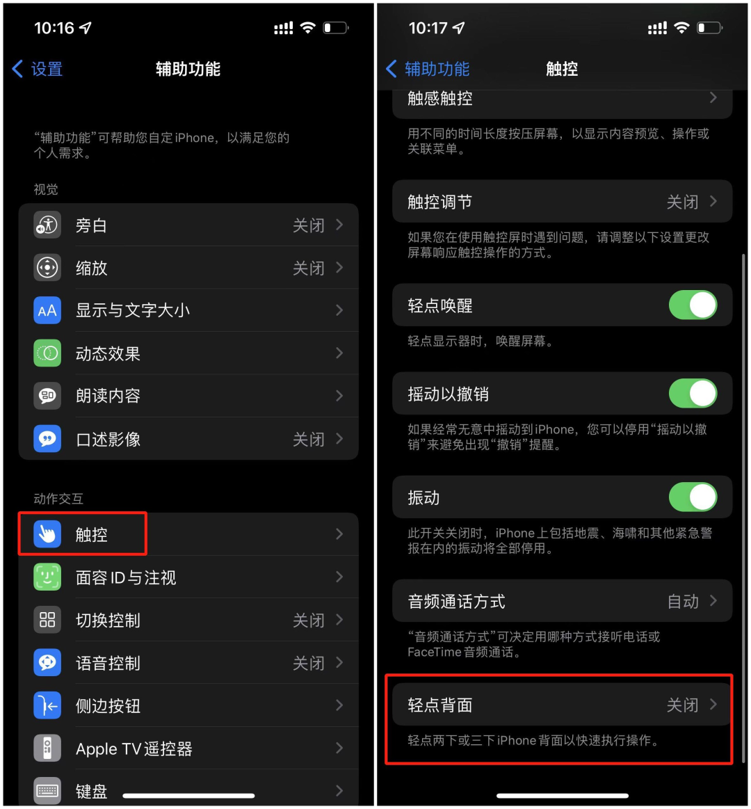 接着在【设置】-【辅助功能】-【触控】中,选择【轻点背面】。
