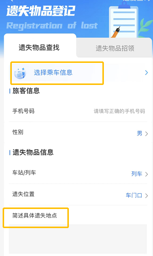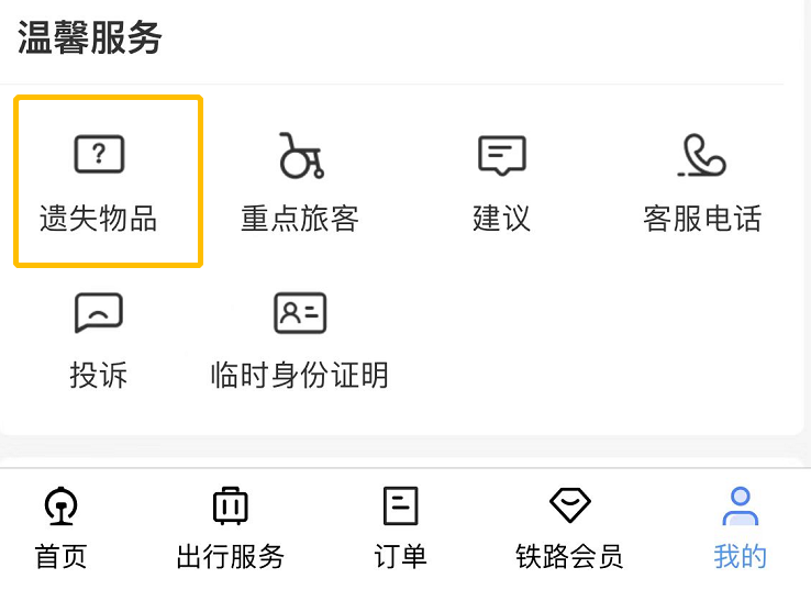 打开12306 App,找到“我的”温馨服务中的“遗失物品”,登记信息,查找遗失物品。