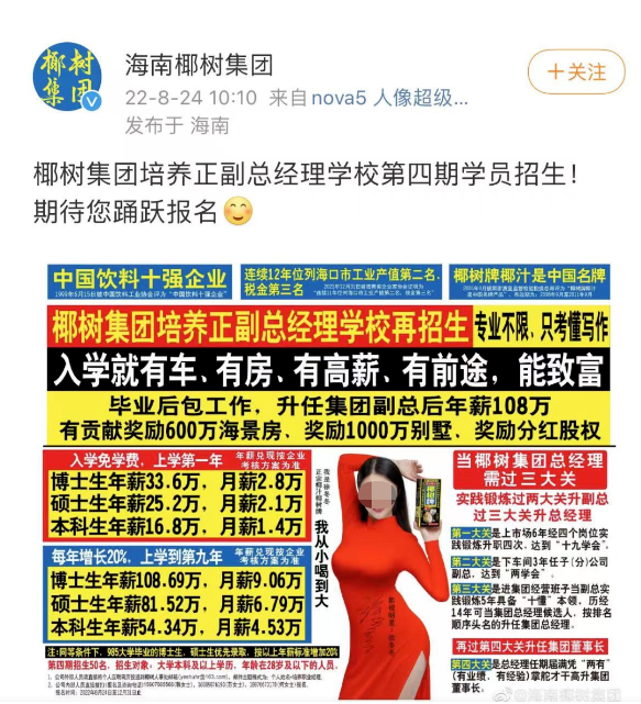 “又黄又土”的椰树椰汁翻车了!低俗招聘广告被喷像“招嫖”……