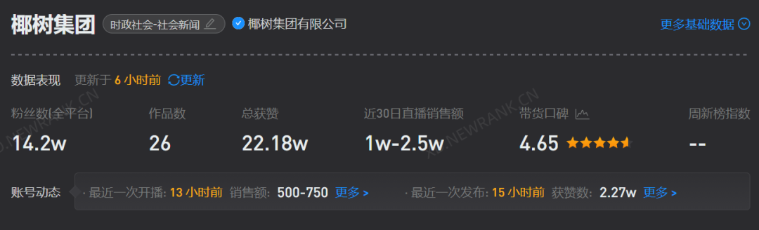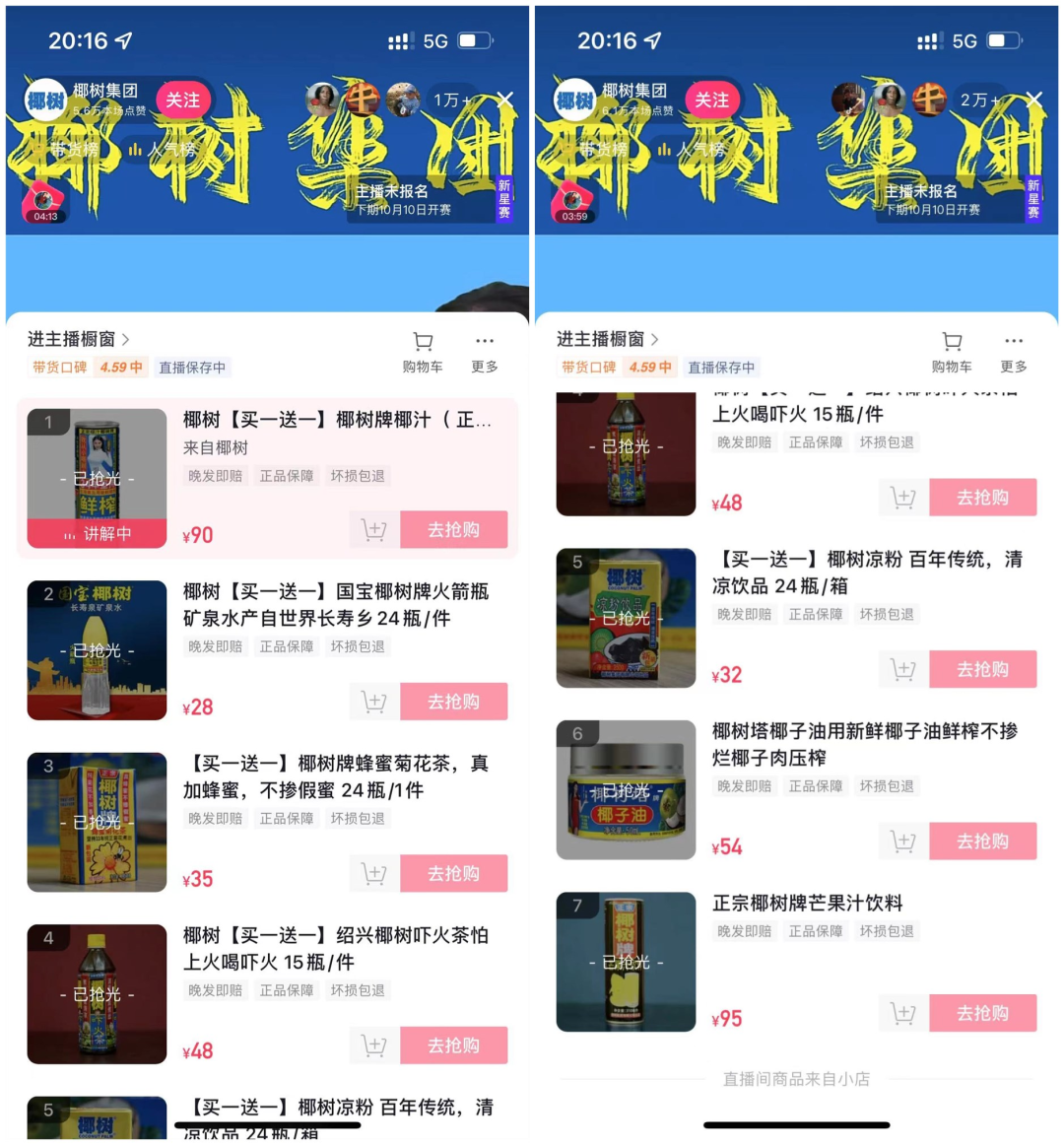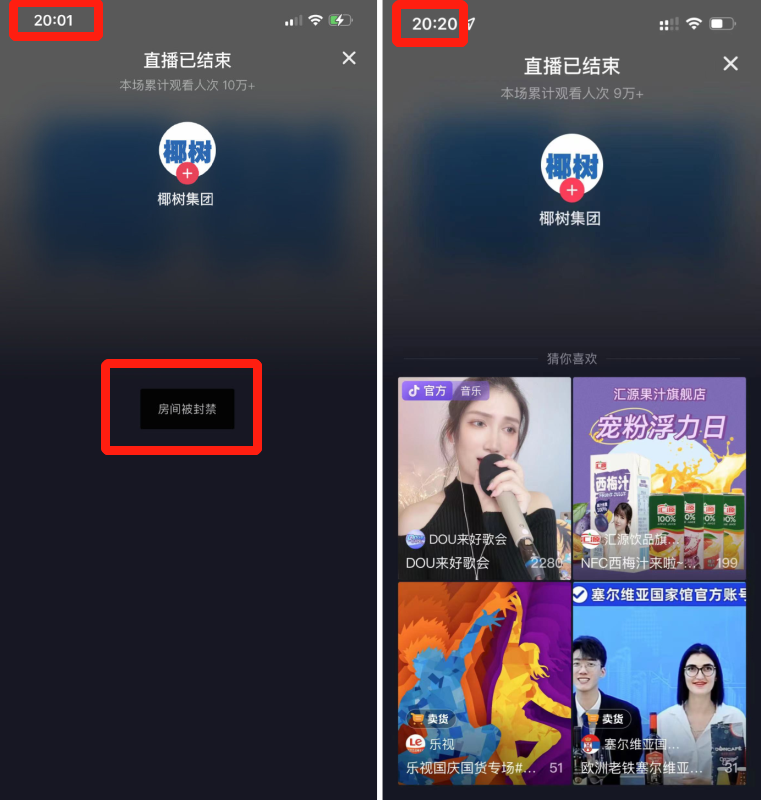不过,昨天晚上椰树集团的账号只直播了12分钟,就被封了两次……