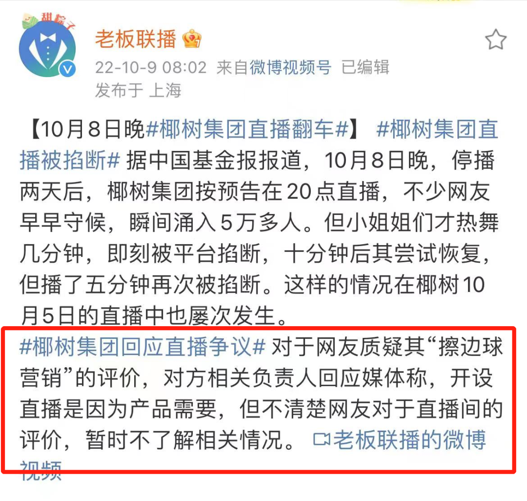 不少网友认为椰树直播被封跟“打擦边球”的风格有关。椰树官方则回应称开直播时产品需要,不清楚网友对直播间的评价。