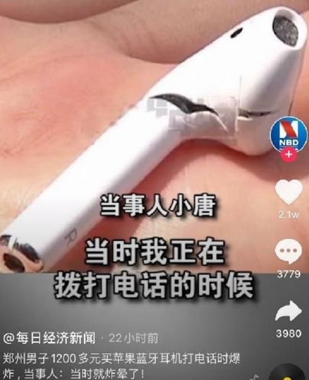 此前郑州一名男士在佩戴AirPods拨打电话时发生意外,右边耳机突然爆炸,爆炸造成“右耳道前壁皮肤裂伤”。