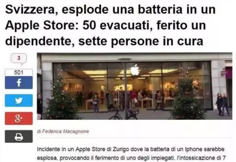 瑞士苏黎世一家苹果零售店,发生了iPhone手机电池爆炸事故,电池在一名店员的手中发生了爆炸,手臂被炸伤,造成1人受伤,7人中毒入院,50余人被紧急疏散。