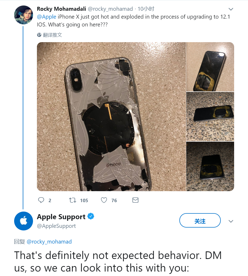 还有个叫Rocky的网友表示,只用了十个月的iPhone X,在升级iOS 12.1系统时,开始冒烟并起火。
