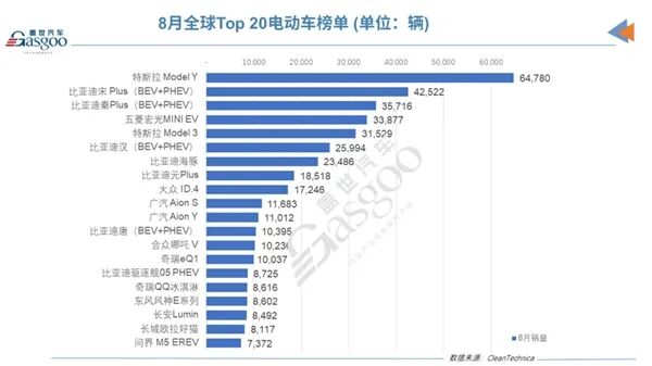 8月电动车榜单榜车型显示,特斯拉Model Y月销量最高,紧跟其后的是比亚迪宋Plus和比亚迪秦Plus,五菱宏光MINI EV自登顶以来首次跌出前三。
