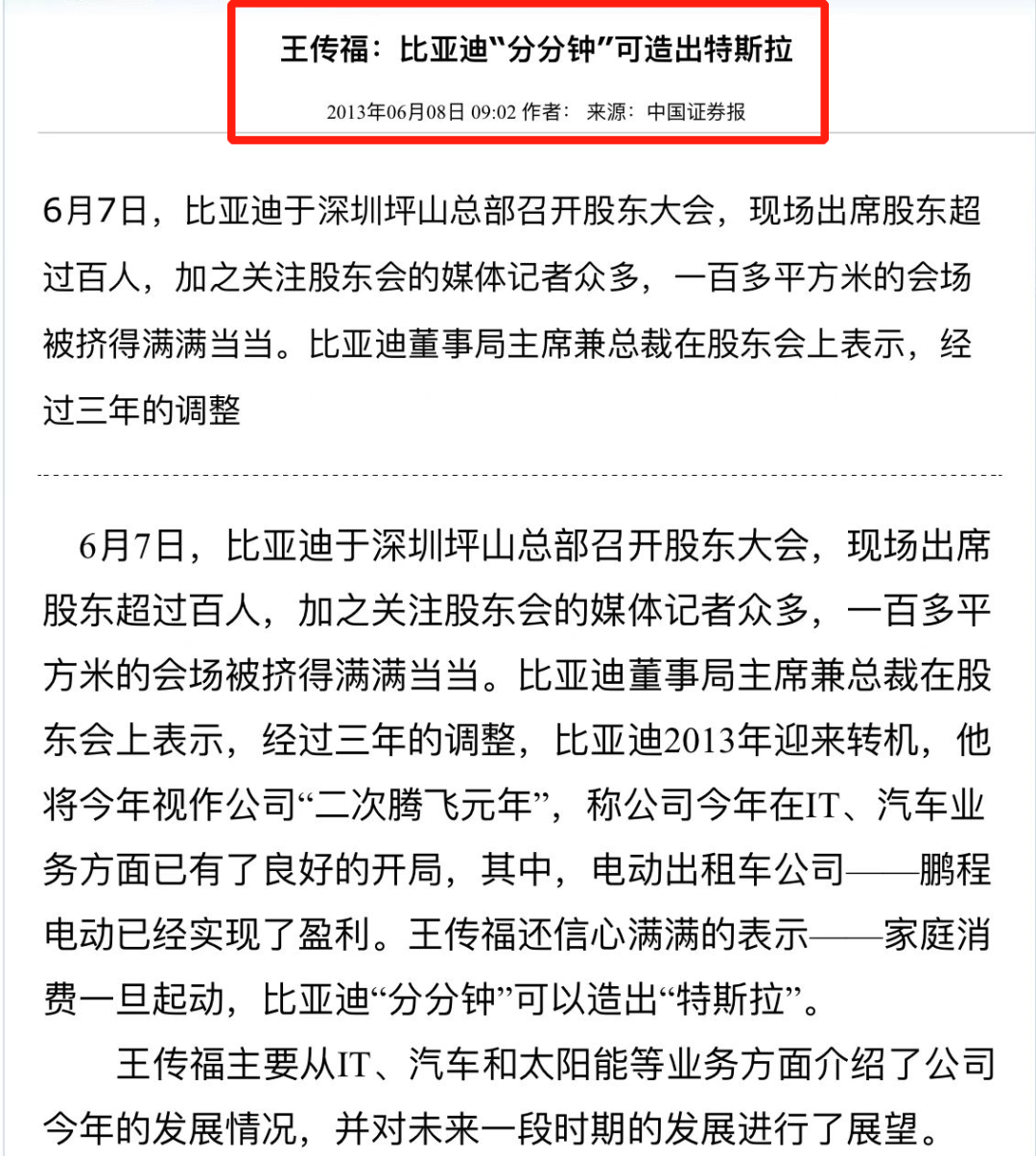早在2013年,比亚迪总裁王传福就曾公开表态,比亚迪“分分钟就可以造出特斯拉”。