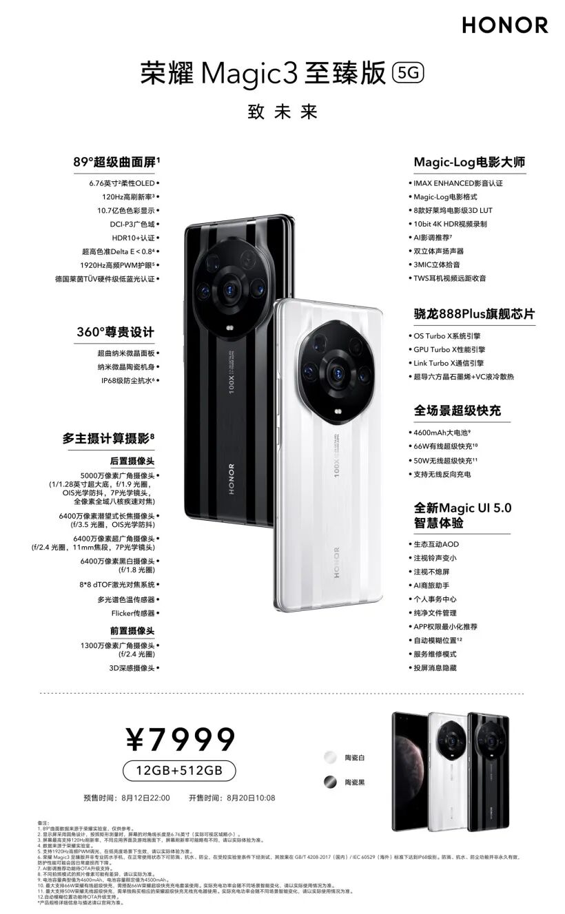 目前荣耀Magic3 至臻版12GB + 512GB存储版本售价7999元,现在已经能在官网进行预约,正式开售时间为8月20日上午10点。