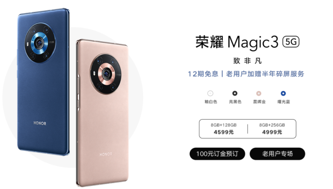 色彩方面,荣耀Magic3有晨晖金、曙光蓝、釉白色、亮黑色4种配色。