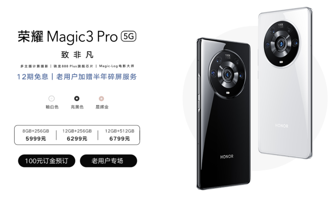 荣耀Magic3 Pro有晨晖金、釉白色、亮黑色3种配色。
