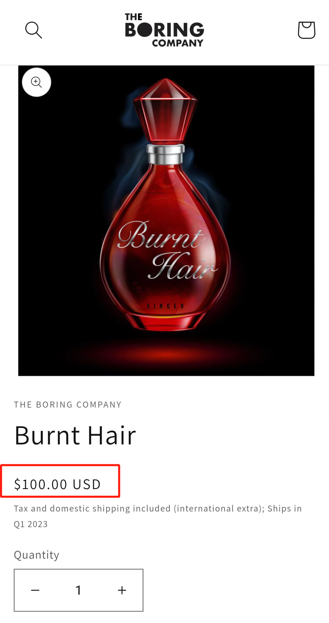 这款名为“烧焦头发(Burnt Hair)”香水,是由马斯克旗下钻洞公司(Boring Company)推出的,价格为100美元(约合人民币718元)。