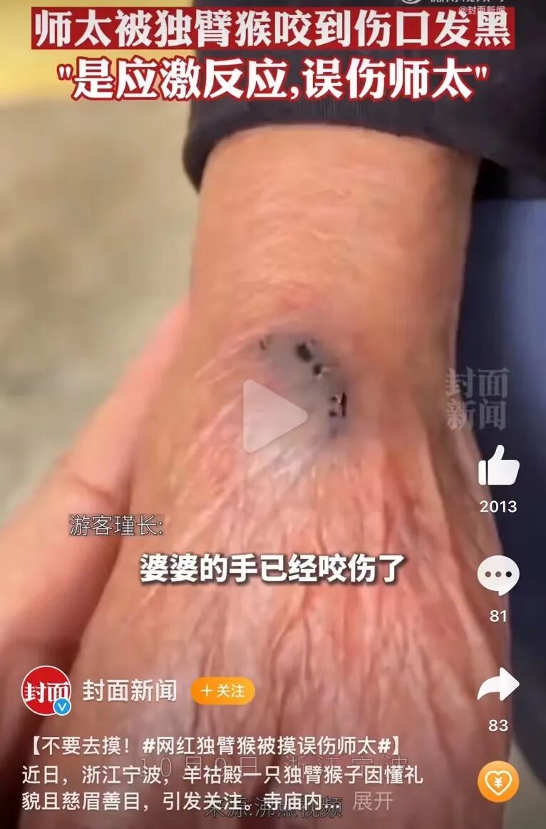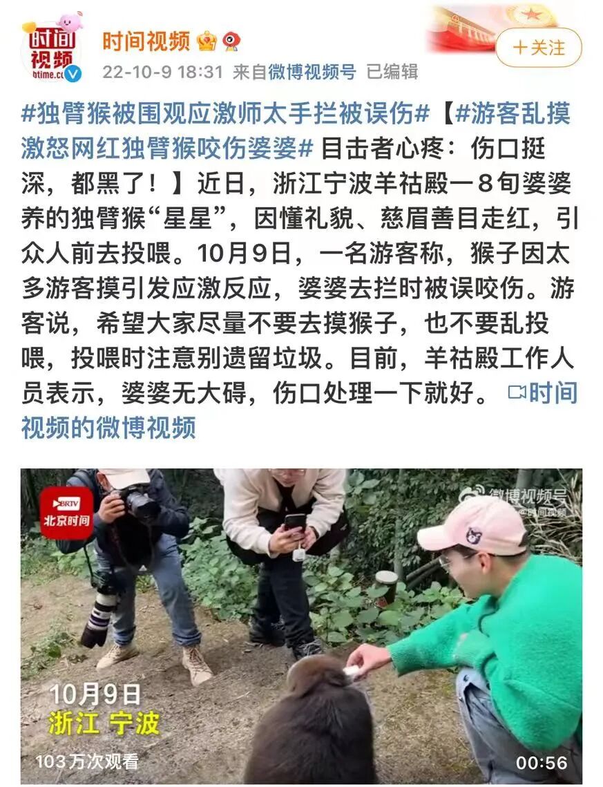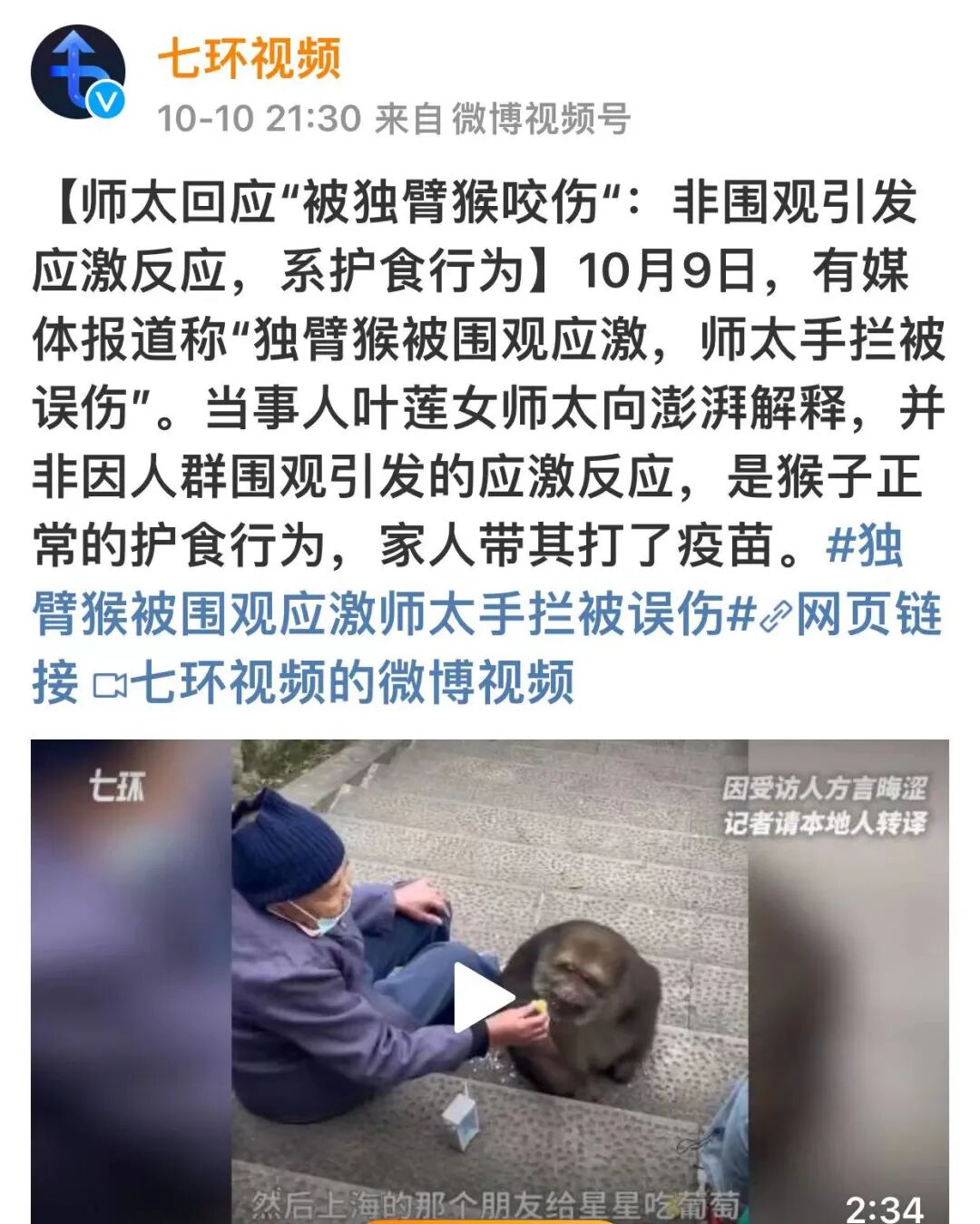 据媒体报道,名为星星的独臂猴因游客抚摸而引起了应激反应,饲养猴子的奶奶去阻拦却误被咬伤。