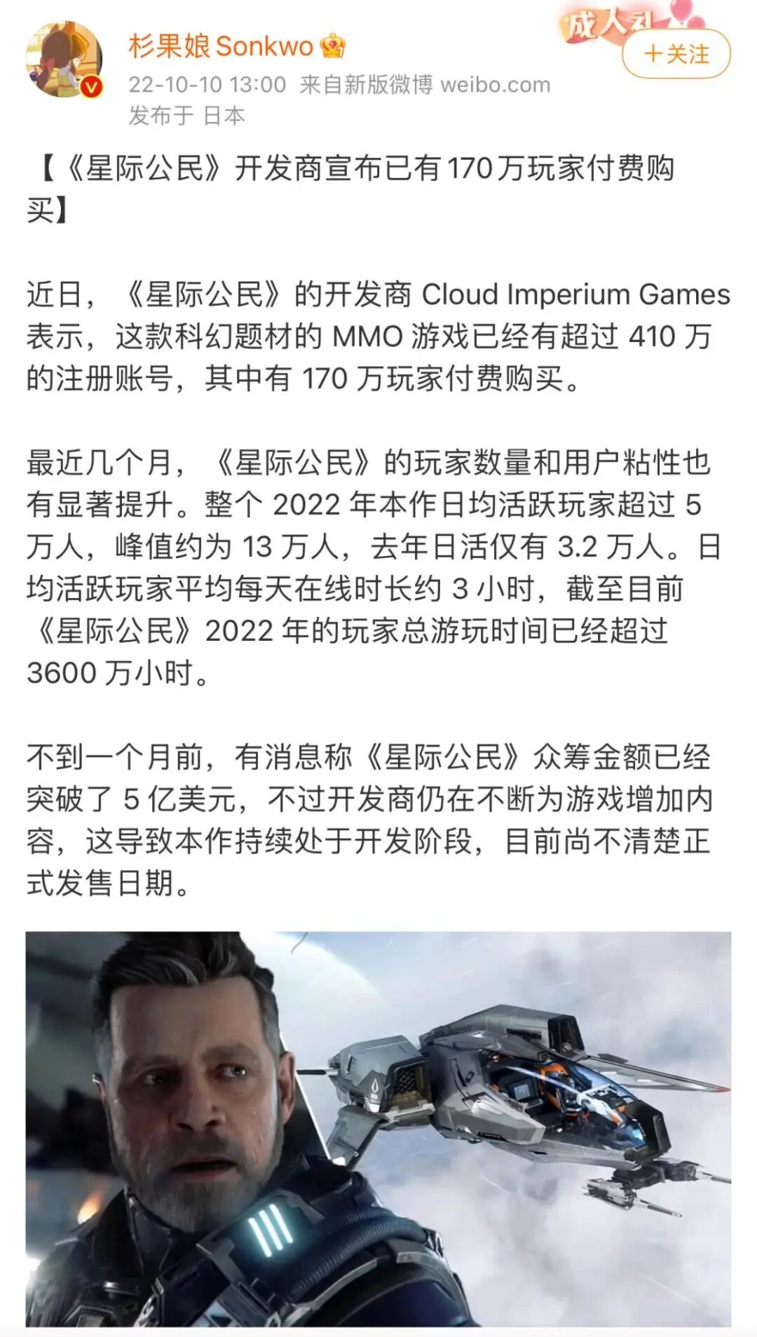 同时,新闻还指出在2022年期间,《星际公民》的平均日活跃用户超过了5万人(去年为3.2万人),而在线人数峰值达到了大约13万人。