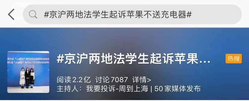 不过就在昨天鸭鸭看到一条有关于"京沪两地法学生起诉苹果不送充电器”的热搜新闻。
