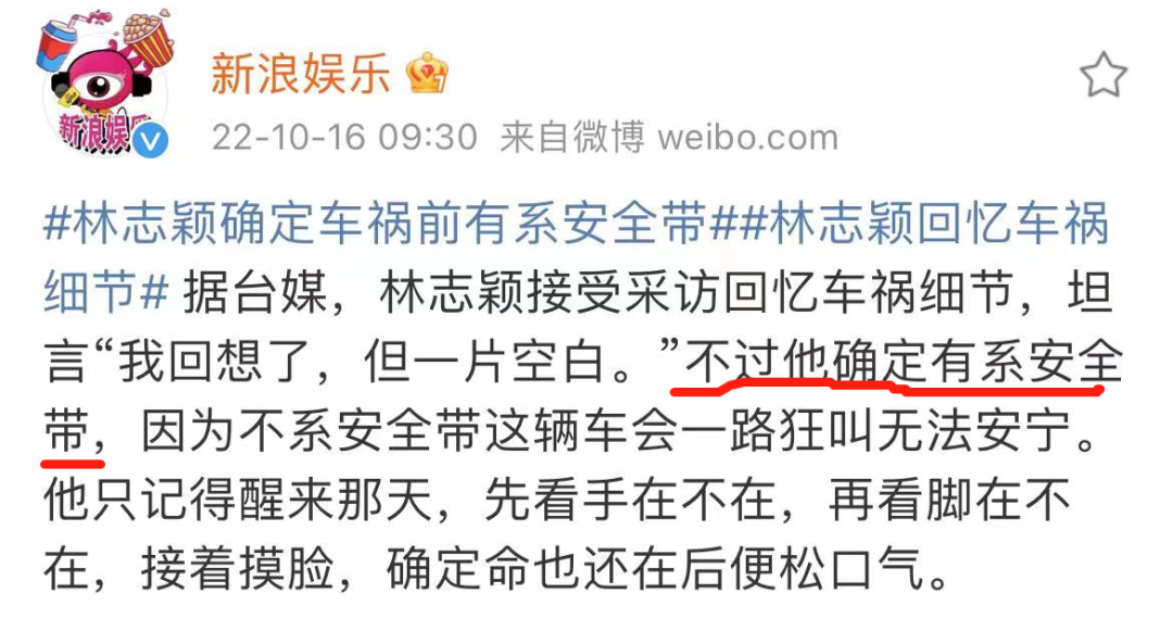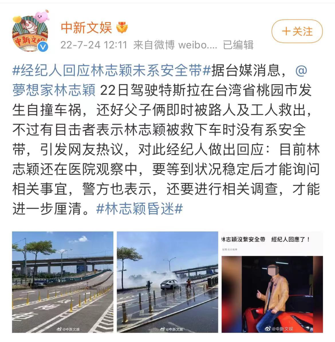 此前,有报道称林志颖被救下时没有系安全带。其经纪人回应要等林志颖状况稳定后才能询问相关事宜。