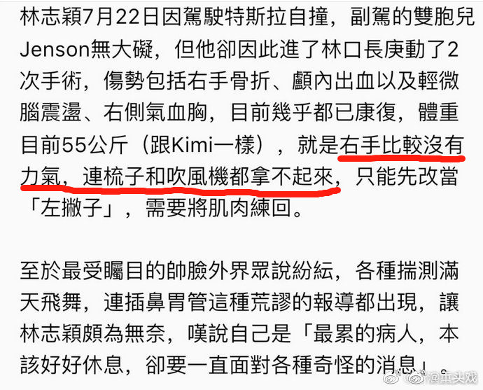 此前林志颖曾称自己“右手比较没有力气,连梳子和吹风机都拿不出来,需要将肌肉练回”。