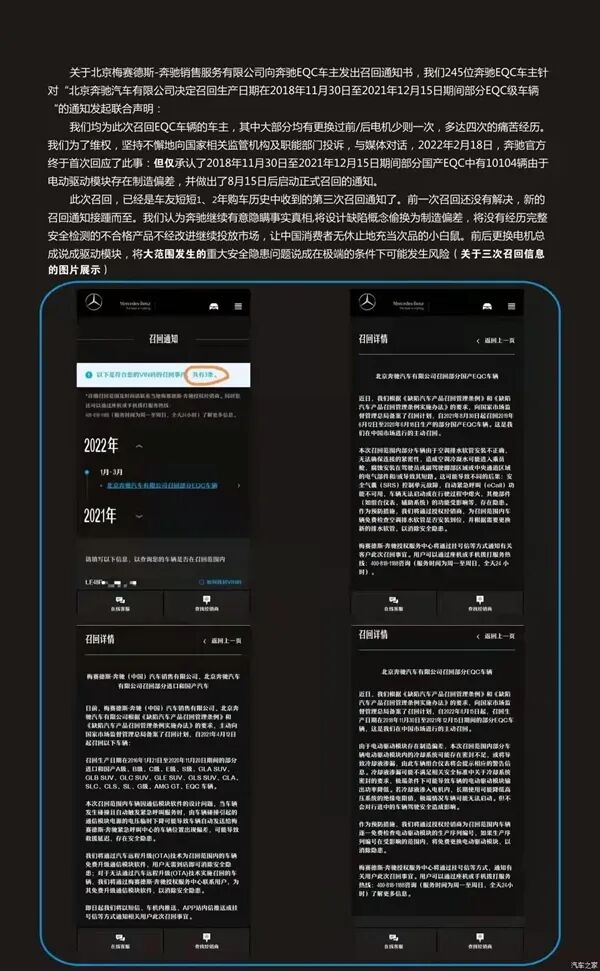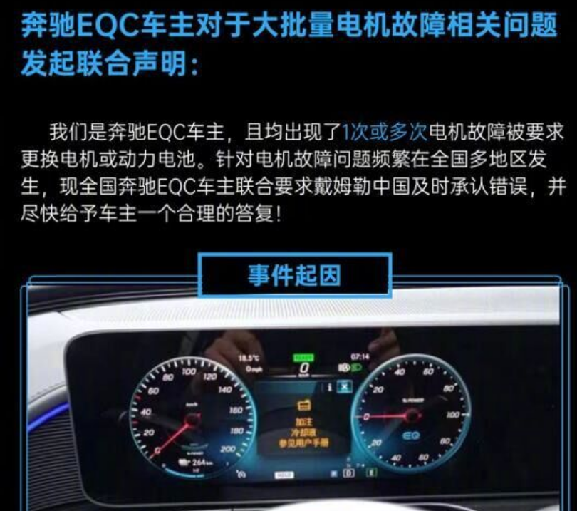 今年年初,68名奔驰EQC车主因其购买的车辆出现电机故障,联合发布声明,要求车企给出一个合理答复。