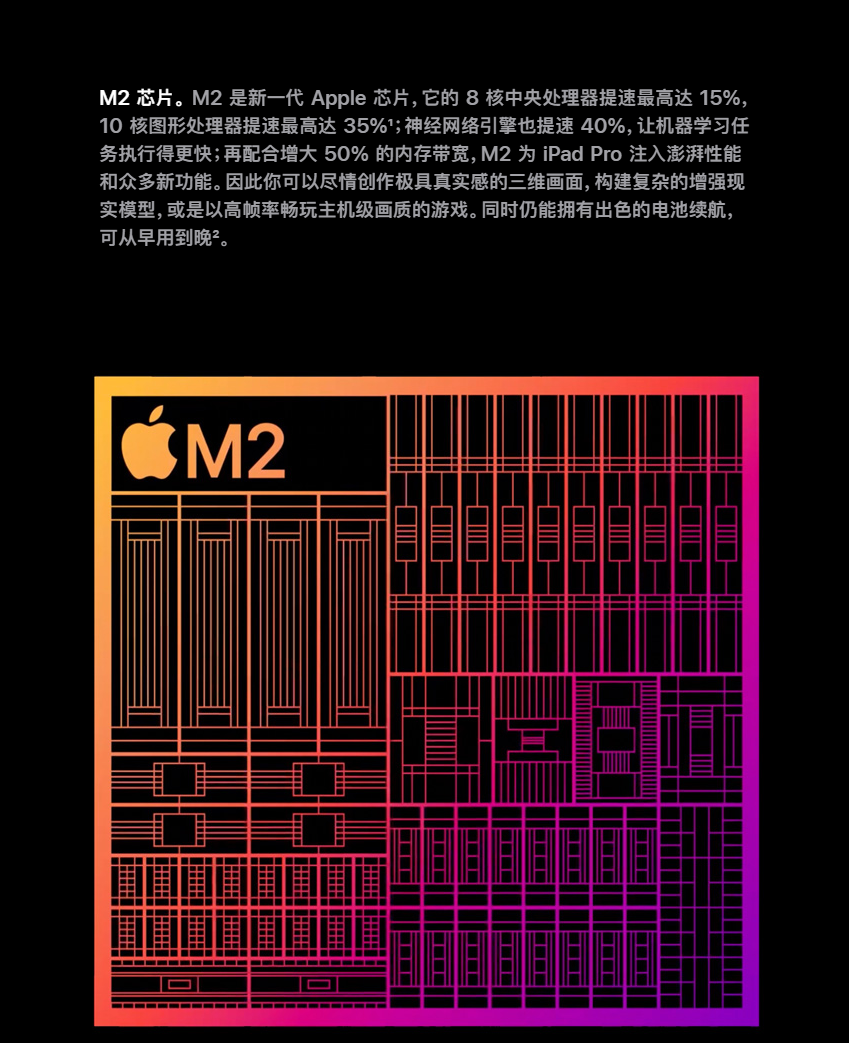 两款不同尺寸的iPad Pro均搭载了最新的M2处理器。苹果官方宣称,M2相较于M1中央处理器速度提升最多15%,图形处理器速度提升最多35% ……