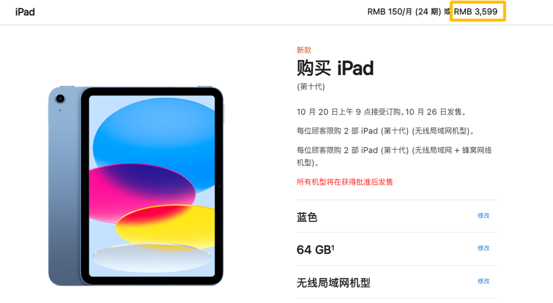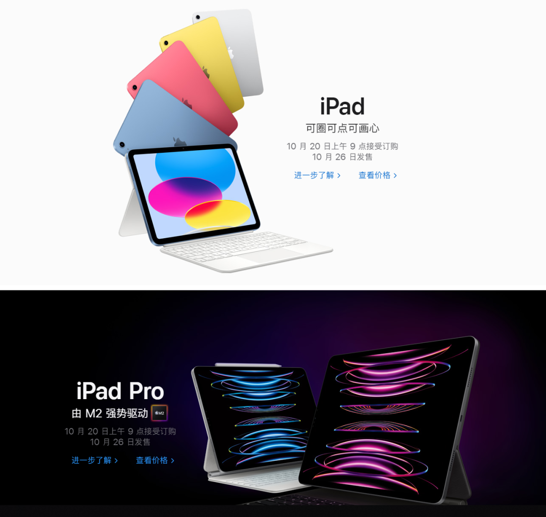 根据苹果官网消息,全新的iPad Pro和iPad 10将于10 月20 日开始接受订购,并在10月26日发售。