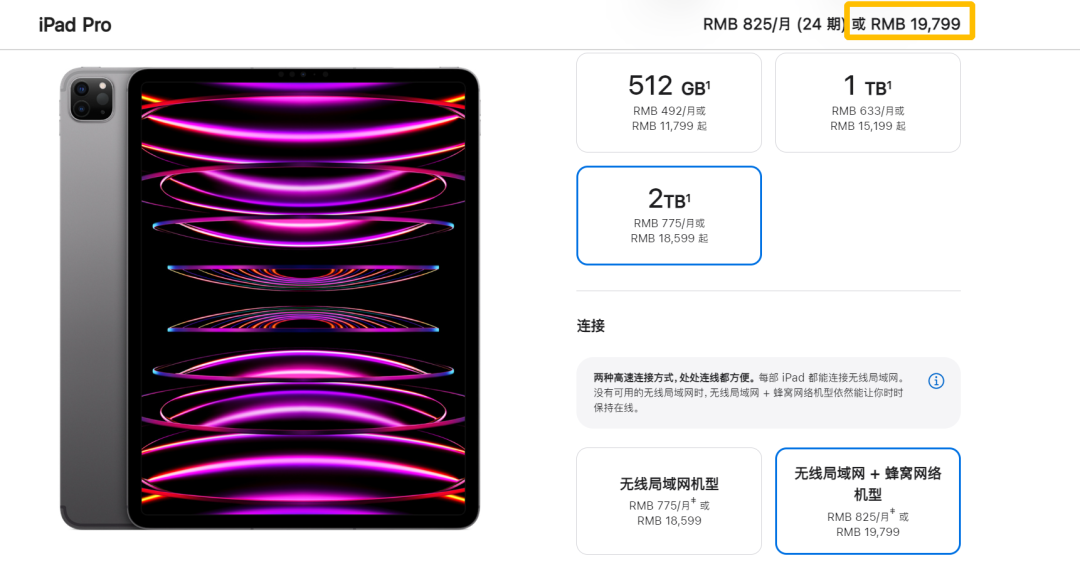 我在官方看了一下,一个12.9英寸+2TB内存+支持蜂窝网络的“顶配”iPad Pro,售价已经接近2万元。