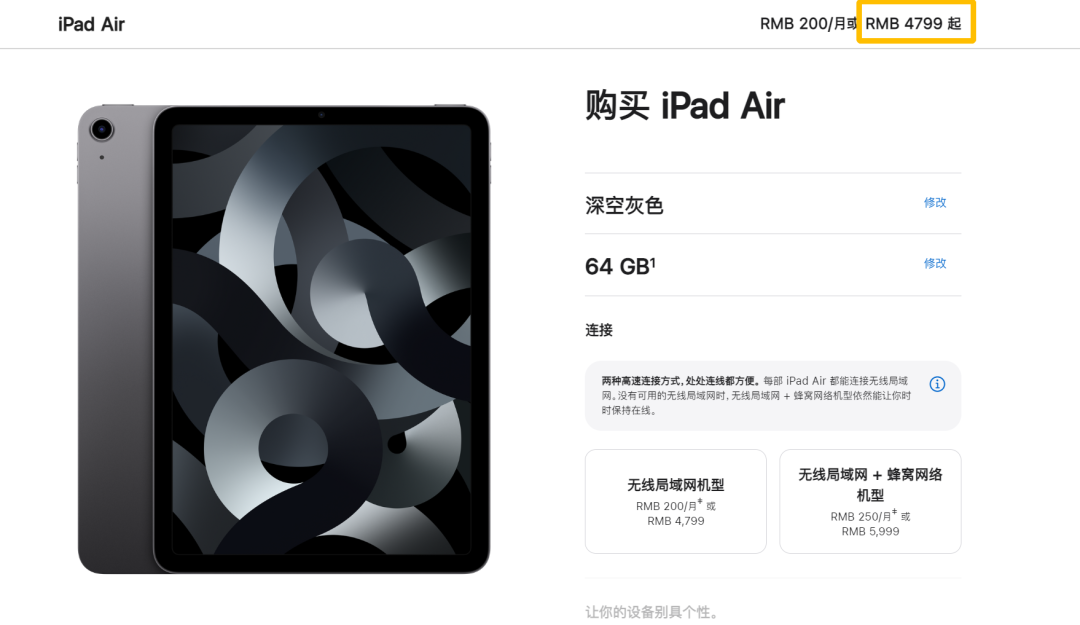 iPad Air 5目前的官网起售价为4799元(此前为4399元)。