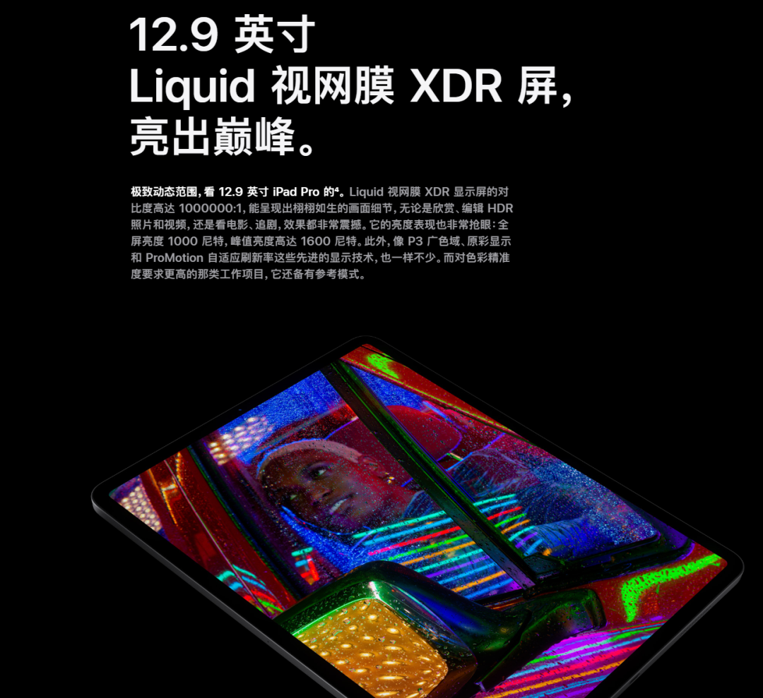 其中12.9英寸的屏幕做了特别升级,搭载了 Liquid 视网膜 XDR 显示屏(mini LED)。