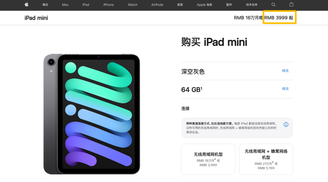 iPad mini目前的官网起售价为3999元(此前为3799元)。