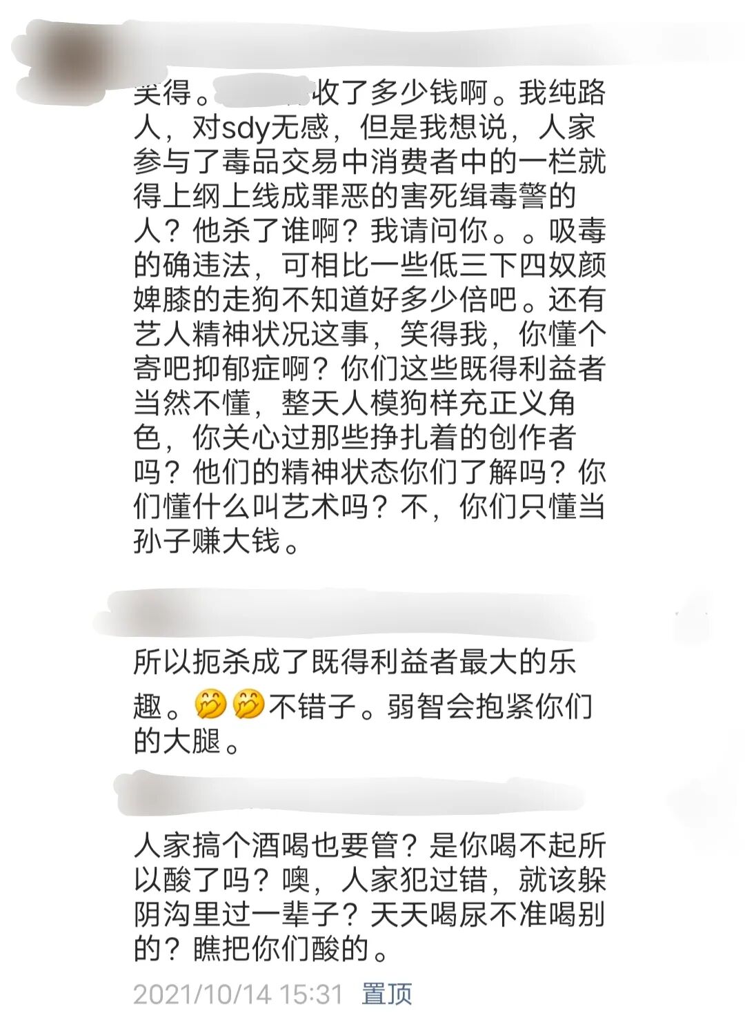 比如某些“吸毒明星”的脑残粉们,虽然自家爱豆已经被封杀,但是他们却依然悄悄的活动在网上的各个角落,为自己的偶像洗白,为吸毒辩解开脱!