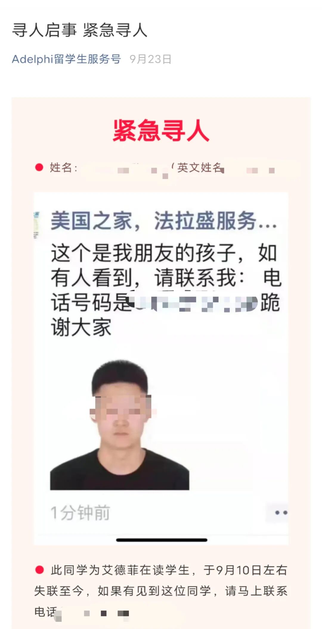 9月23日,一条寻人启事发布在Adelphi留学生服务号上。